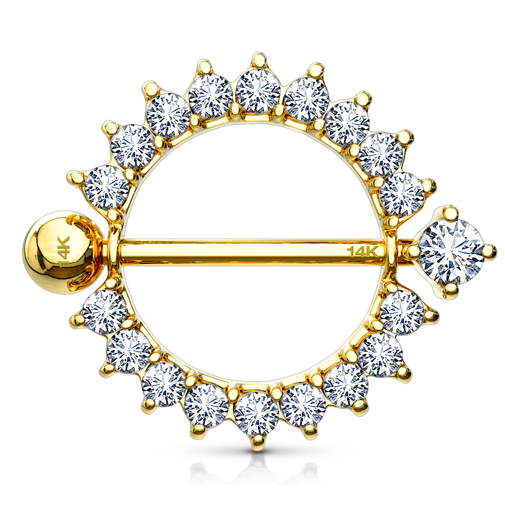 Fehlt dir noch ein exklusiver Brustschmuck für dein Brustwarzenpiercing? Dann hast du jetzt die Möglichkeit deine Brustwarze mit einem Schmuckstück aus echtem 14 karätigen Gold mit klaren, schönen Steinen entlangs der Kante, zu verzieren. Das Schmuckstück hat das Design einer kleinen Sonne, dessen viele kleine Steine um die Wette glitzern und glimmern. Jeder einzelne Stein wurde einzeln eingefasst und nicht aufgeklebt.