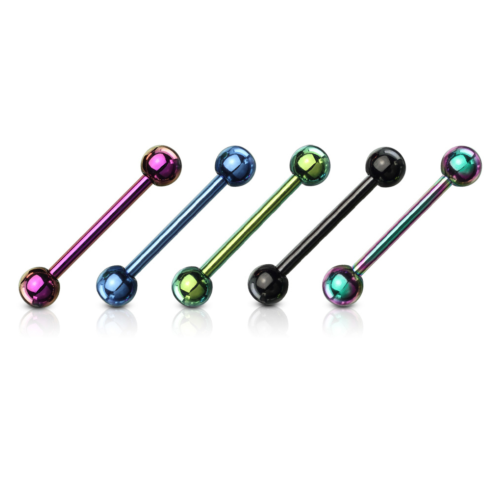 Du erhältst hier fünf hochwertige Zungenpiercings aus chirugischen Stahl, die mit echtem Titan beschichtet wurden. Es sind 4 verschieden farbige Zungenpiercings und eins in Regenbogenfarben.