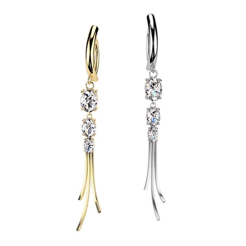 Der Bauchnabel-Clicker mit Schmucksteinen und Ketten verleiht deinem Bauchnabelpiercing zusätzliche Details. Die Schmucksteine sitzen in einer feinen Krappenfassung in der Mitte, von der feine feine Ketten herabhängen, die für einen glamourösen Look sorgen. Erhältlich in den Farben Gold und Silber, ist dies genau der richtige Schmuck, wenn du mal etwas anderes als einen schlichten Stecker suchst.