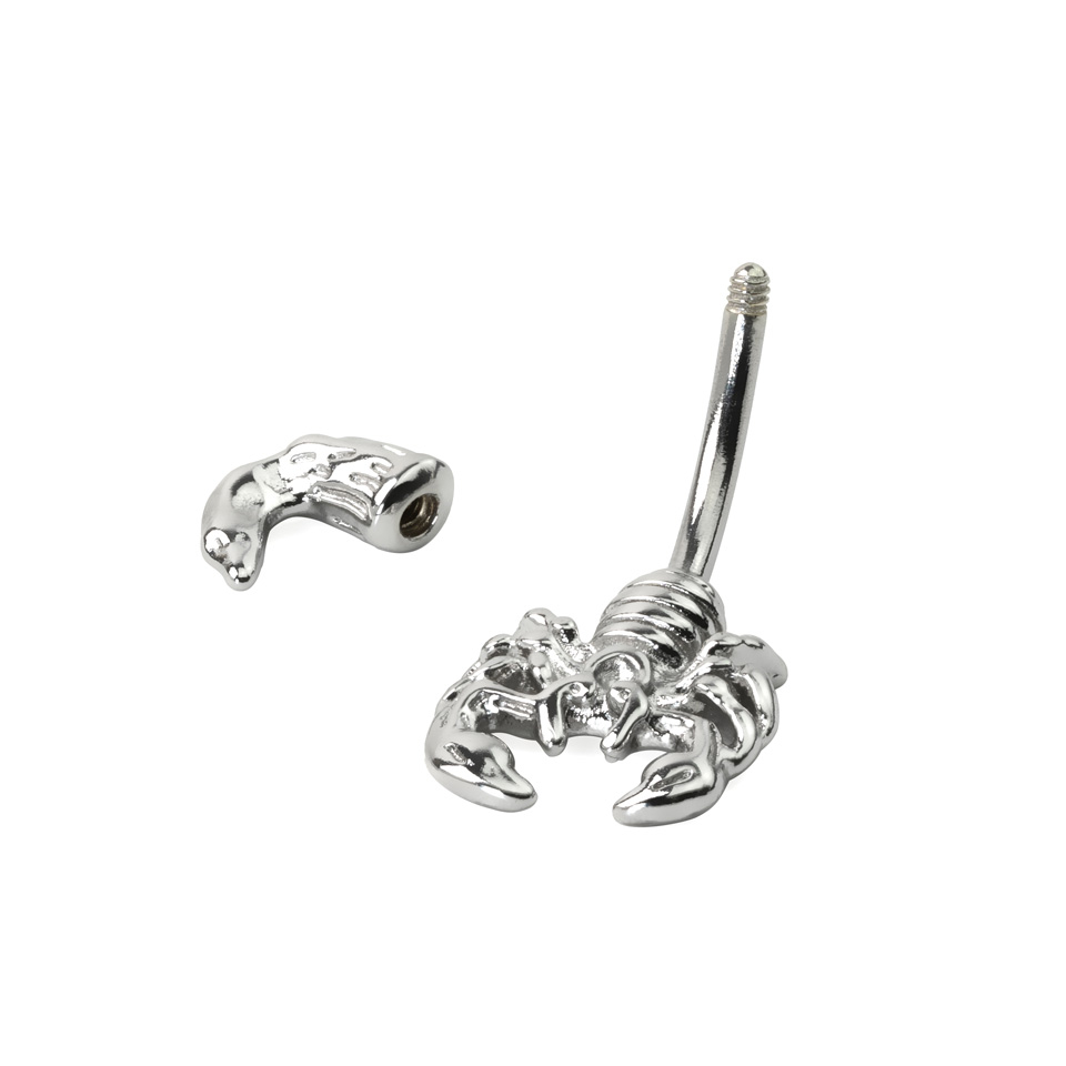 Es ist ein Bauchnabelpiercing ohne Anhänger oder anderen losen Teilen und eignet sich deswegen besonders gut als Alltagsschmuck. Der schöne Skorpion ist besonders detailliert gearbeitet worden und besteht aus zwei Teilen, die zusammen das starke, kleine Krabbeltier ergeben. Anstelle einer traditionellen Bundkugel hast du hier die komplette Vorderseite des Skorpions mit dem Körper, Beinen, Scheren, Kopf und Fühlern. Auf dem Rücken sind sogar die kleinen Rillen eines echten Skorpions zu sehen.