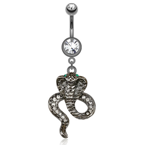 Dieses Bauchnabelpiercing hat es in sich. Denn der Anhänger gleicht einer lebensechten Schlange. Denn die schöne Kobra schlängelt sich wie sehr detailliert um sich selbst. Der Schmuck wurde im 3D-Stil entworfen, so daß sich der Kopf der Kobra nach vorne hebt, wie bei einer echten Schlange. Auf der Rückseite ist auch das echte Schlangenmuster wieder zu erkennen. Dieselben kleinen Rillen sind auch auf dem oberen Stück der Schlange auf der Vorderseite zu sehen. Der Rest der Vorderseite wurde mit vielen kleinen klaren Steinen versehen sowie zwei kleinen türkisgrünen Steinen für die Augen. Im Großen und Ganzen eine wirklich detaillierte Ausführung einer Kobra.
