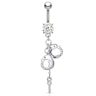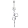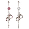 Super cooles und etwas provozierendes Bauchnabelpiercing mit einem großen Stein und Handschellen im Anhänger. Diese kleinen Handschellen wurden zusätzlich mit kleinen schönen Steinchen entlängs der Kante verziert. Du kannst zwischen rosa oder klaren Steinchen wählen. Die Farbe, für die du dich entscheidest, wird in der großen Bundkugel sowie den Handschellen zu sehen sein.