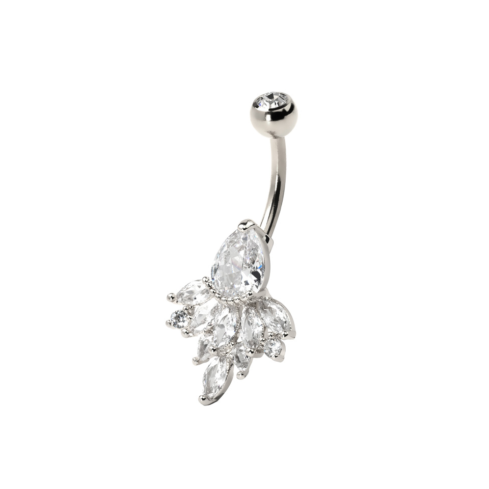 Dieses Bauchnabelpiercing sieht im ersten Moment aus, wie jedes andere Bauchnabelpiercing. Ein gebogener Stab von 10 mm und einer Topkugel mit einem Stein. Aber wenn man genauer hinschaut, sieht man, daß die untere Kugel mit einem großen, tropfenförmigen Stein ersetzt wurde. Unter diesem Tropfen ist eine ganze Gruppe weiterer Steine, die teilweise ebenfalls tropfenförmig und teilweise länglich sind. Genau genommen sind sie marquise-geschliffen. Unter dem Tropfenstein sitzen somit fünf marquise-geschliffene Steine und darunter wiederum vier tropfenförmige Steine. - Immer einer zwischen den länglichen. Dieses extravagante Schmuckstück endet mit einem großen, länglichen Stein.