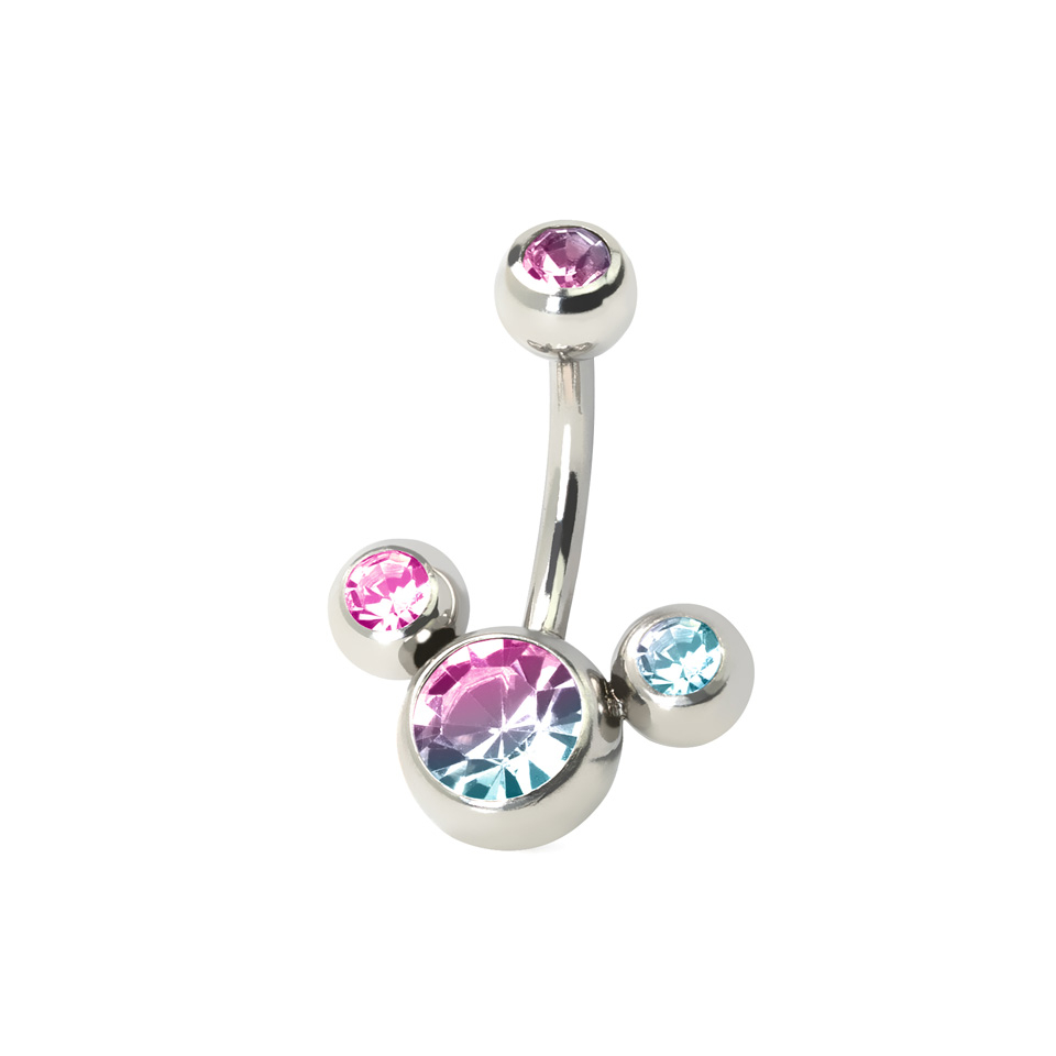 Wie jedes Bauchnabelpiercing hat auch dieses hier einen Standardstab von 10 mm Länge und zwei Kugeln an den Enden. Der Unterschied geht jedoch von der extravaganten Bundkugel aus. Denn diese hat über die normale Kugel hinaus noch zwei weitere, kleinere Kugeln, die links und rechts sitzen. Alle Kugeln haben einen farbigen Stein. Die Farbe kannst du natürlich selbst bestimmen.