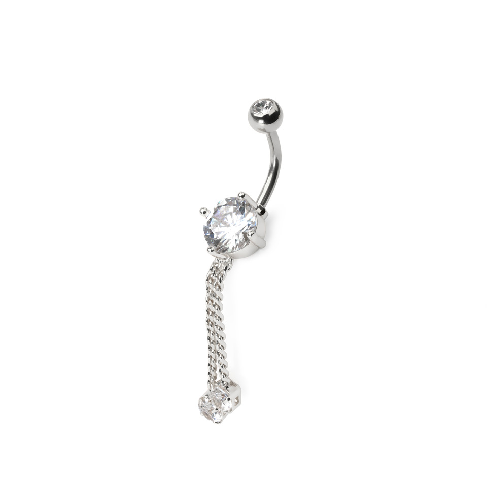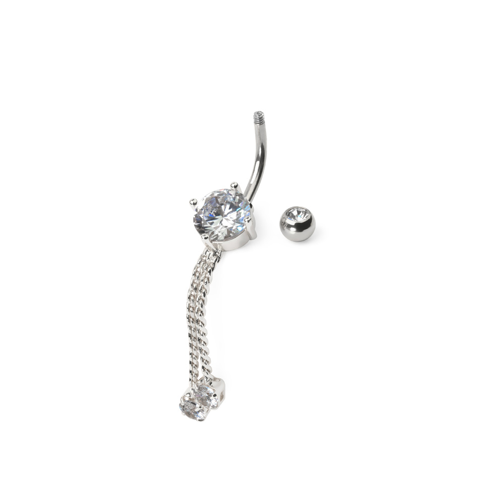 Dieser hübsche Bauchnabelring ist ein echter Hingucker. Die mit kleinen Steinen besetzte Kette verleiht dem Ring eine gewisse Eleganz und Lebendigkeit und macht ihn zu einem einzigartigen Schmuckstück. Der Ring besteht aus Chirurgenstahl, der für Haltbarkeit und Tragekomfort sorgt. Der Stab misst 10 mm in der Länge und hat eine Stabstärke von 1,6 mm. Die Ketten hängen 28 mm vom Hauptstein ab. Er ist erhältlich in den Farben gold, silber und rotgold und wird mit klaren Steinen besetzt. Dieser Bauchnabelring ist das perfekte Accessoire, um deinem Look etwas mehr Ausdruck zu verleihen.