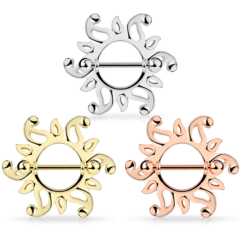 Der Stab besteht aus Chirurgenstahl, einem der meist verwendeten Materialien in der Piercingbranche. Das Schild mit seinen wellenartigen Formen besteht aus Messing, daß seine blanke oder goldene Farbe durch eine Rhodiumsbeschichtung erhalten hat.