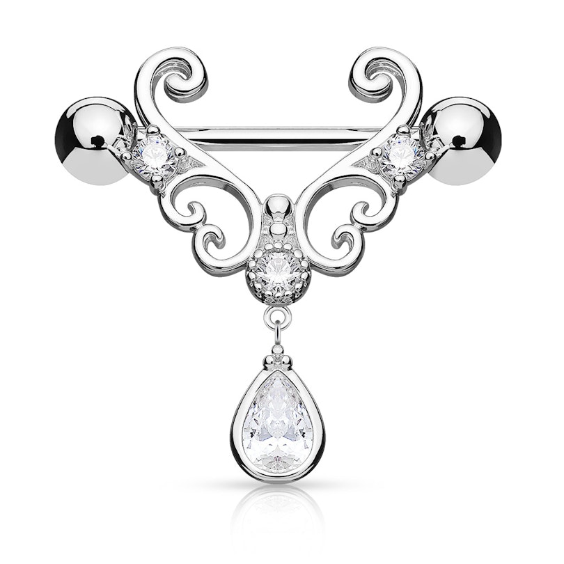 Aber wenn dieser Schmuck die geeignete Besitzerin gefunden hat und an seinem rechtmäßigen Platz sitzt, dann sieht es einfach nur wunderschön aus. Die herzählichen Verschnörkelungen winden sich ganz zart um die Nippel. Da das Herz in der Mitte unterbrochen ist, winden sich die Enden nach Innen. Wenn man längs der Kante schaut, entdeckt man auf jeder Seite klare Steine, die weitere kleine Herzen zieren. Am unteren Ende des großen Herzens ist ebenfalls ein Stein platziert, an dem ein kleines Bindglied hängt und einen noch größeren Stein präsentiert, der einem Tropfen ähnelt und aussieht, als wenn er gerade vom Herzen herunter tropft.