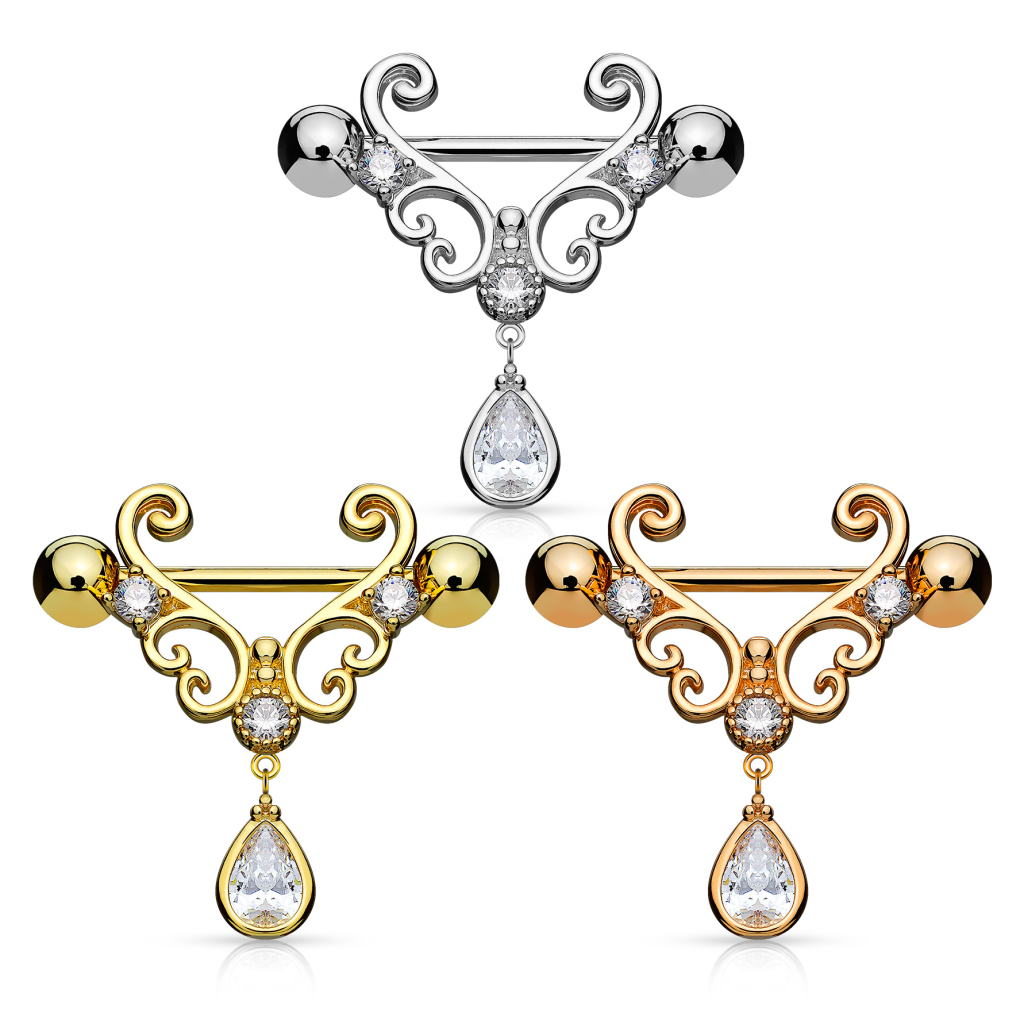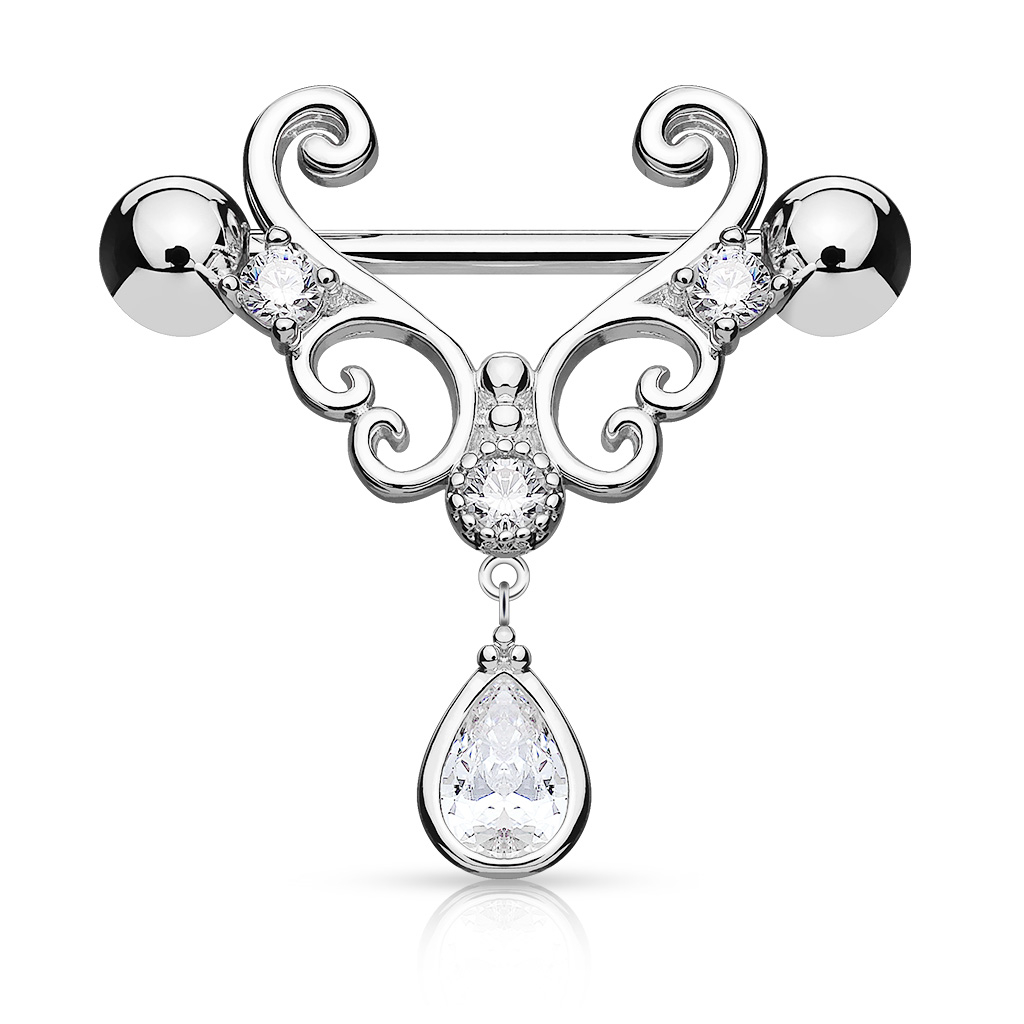 Aber wenn dieser Schmuck die geeignete Besitzerin gefunden hat und an seinem rechtmäßigen Platz sitzt, dann sieht es einfach nur wunderschön aus. Die herzählichen Verschnörkelungen winden sich ganz zart um die Nippel. Da das Herz in der Mitte unterbrochen ist, winden sich die Enden nach Innen. Wenn man längs der Kante schaut, entdeckt man auf jeder Seite klare Steine, die weitere kleine Herzen zieren. Am unteren Ende des großen Herzens ist ebenfalls ein Stein platziert, an dem ein kleines Bindglied hängt und einen noch größeren Stein präsentiert, der einem Tropfen ähnelt und aussieht, als wenn er gerade vom Herzen herunter tropft.