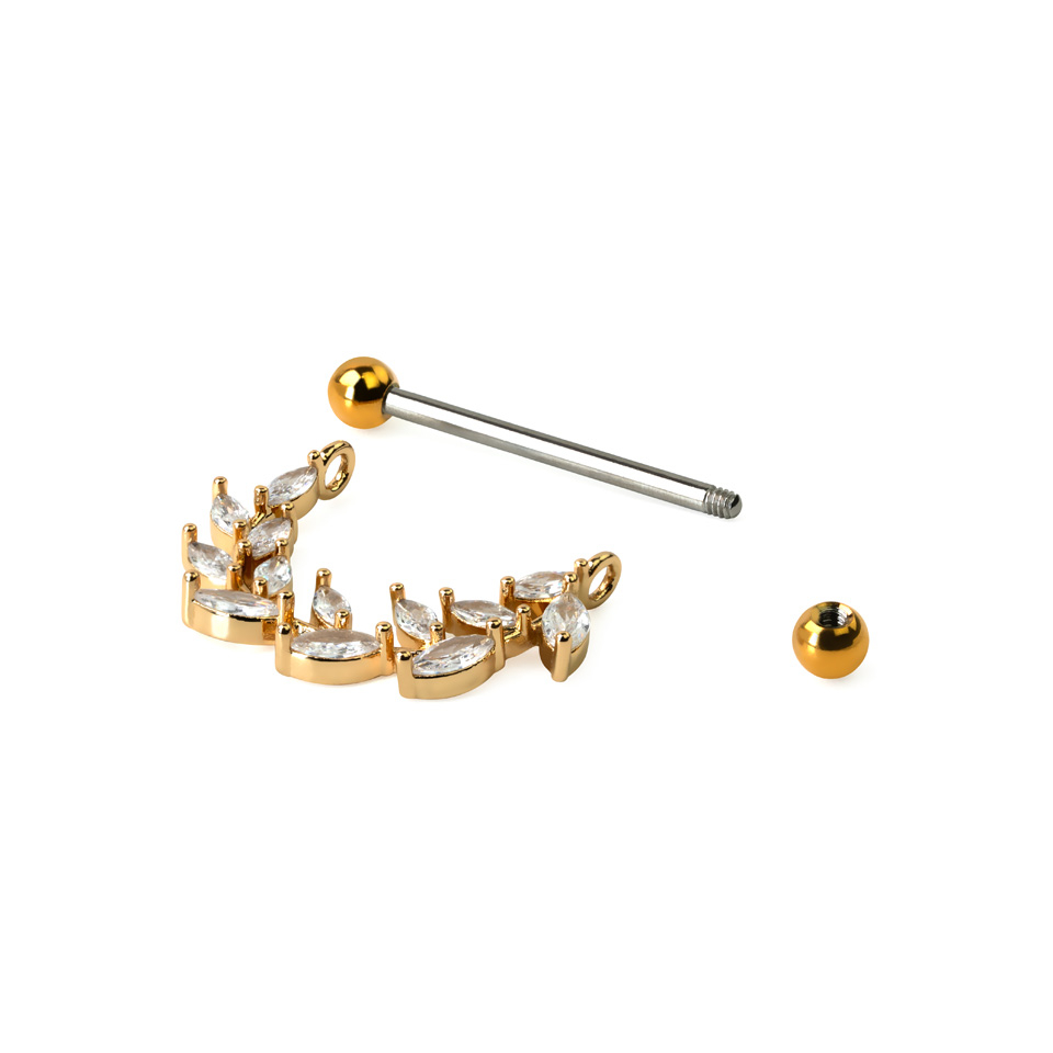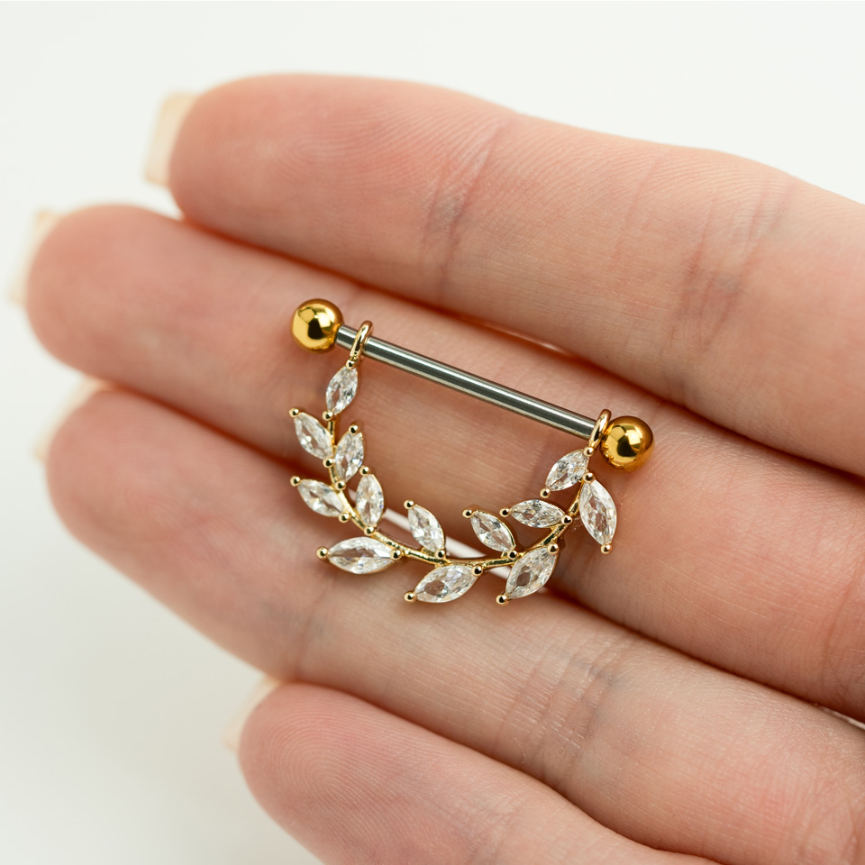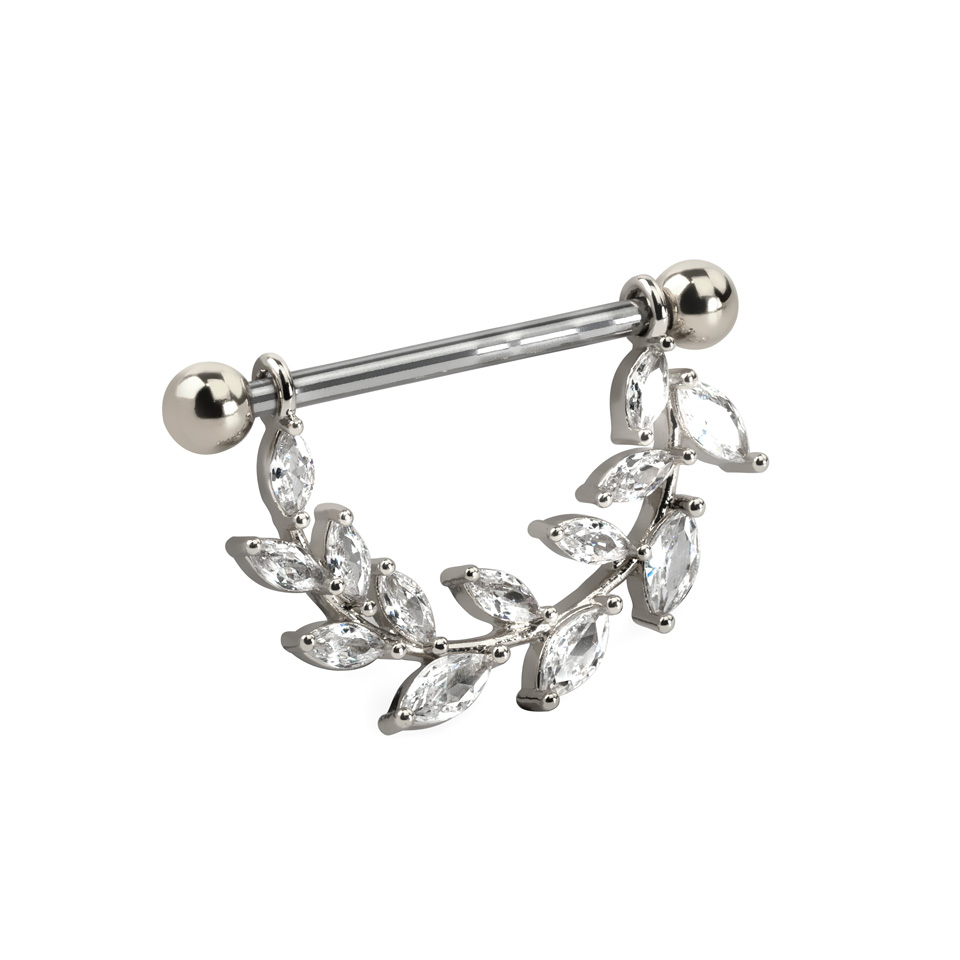 Wenn du auf der Suche nach einem femininen Brustwarzenpiercing bist, dann könnte dieser Schmuck das genau richtige für dich sein. Dieser Schmuck besteht aus einem geraden Stab, zwei Verschlusskugeln und einem Anhänger. Die Kugeln können abgeschraubt werden (und wenn so gewünscht, auch ersetzt werden). Der Anhänger des Schmucks besteht im Grunde aus kleinen Marquise-Steinen, welche zusammen das Design bilden. Die Steine wirken die Blätter eines Astes, dieses Design verleiht dem Schmuck einen friedlichen Ausdruck.