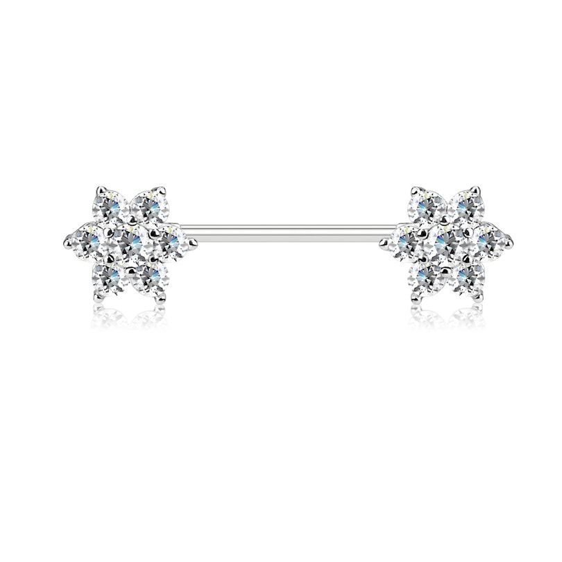 Super elegantes Brustwarzenpiercing mit glitzernden Blumen an beiden Seite des Stabes.
