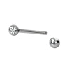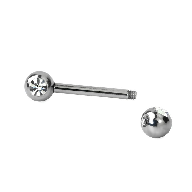 Dieses Brustwarzenpiercing ist ganz schlicht gehalten. Es ist ein gerader Stab mit zwei Kugeln - Eine an jedem Ende. Beide Kugeln sind mit einem einzelnen Stein versehen, der hier, nicht wie bei den meisten anderen Kugeln oben auf sitzt, sondern nach vorne zeigt, was diesen Schmuck ideal für ein Brustwarzenpiercing macht, da man ja die Steine gut sehen kann. Das setzt natürlich voraus, dass das Schmuckstück nicht verkehrt eingesetzt ist.