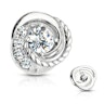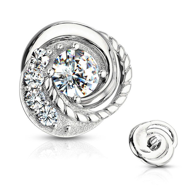 Dieses Dermal ist eines der interessanteren. Durch sein auffälliges Design hebt es sich klar von anderen Schmuck ab. Eine Seite wurde mit einem schönen geflochtenen Muster verziert, dieses beginnt außen und bewegt sich bis hin zur Mitte des Schmucks. Die andere Seite hat eine raue Oberfläche, auf der eine Reihe an Steinen sitzt - auch diese beginnt von außen und bewegt sich zur Mitte hin. Zu guter Letzt wurde die Mitte des Schmucks mit einem schönen Mittelstein verziert, welcher den Schmuck komplettiert.