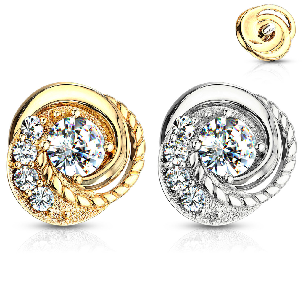 Dieses Dermal ist eines der interessanteren. Durch sein auffälliges Design hebt es sich klar von anderen Schmuck ab. Eine Seite wurde mit einem schönen geflochtenen Muster verziert, dieses beginnt außen und bewegt sich bis hin zur Mitte des Schmucks. Die andere Seite hat eine raue Oberfläche, auf der eine Reihe an Steinen sitzt - auch diese beginnt von außen und bewegt sich zur Mitte hin. Zu guter Letzt wurde die Mitte des Schmucks mit einem schönen Mittelstein verziert, welcher den Schmuck komplettiert.