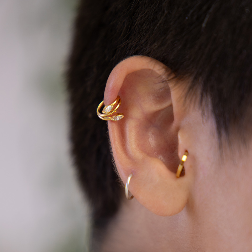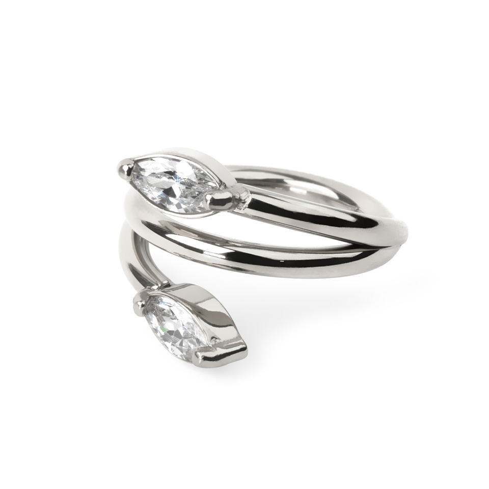 Feiner Scharnierring aus Chirurgenstahl. Dieser schöne Ring hat zwei CZ-Steine im Marquise-Schliff, die wie Blätter an einer Weinrebe aussehen. Der Ring ist wahlweise mit einem Durchmesser von 8 mm oder 10 mm und in goldener oder silberner Ausführung erhältlich. Dieser vielseitige Schmuck passt wunderbar zu allen Arten von Ohrpiercings, insbesondere zu Knorpelpiercings wie Rook und Helix.