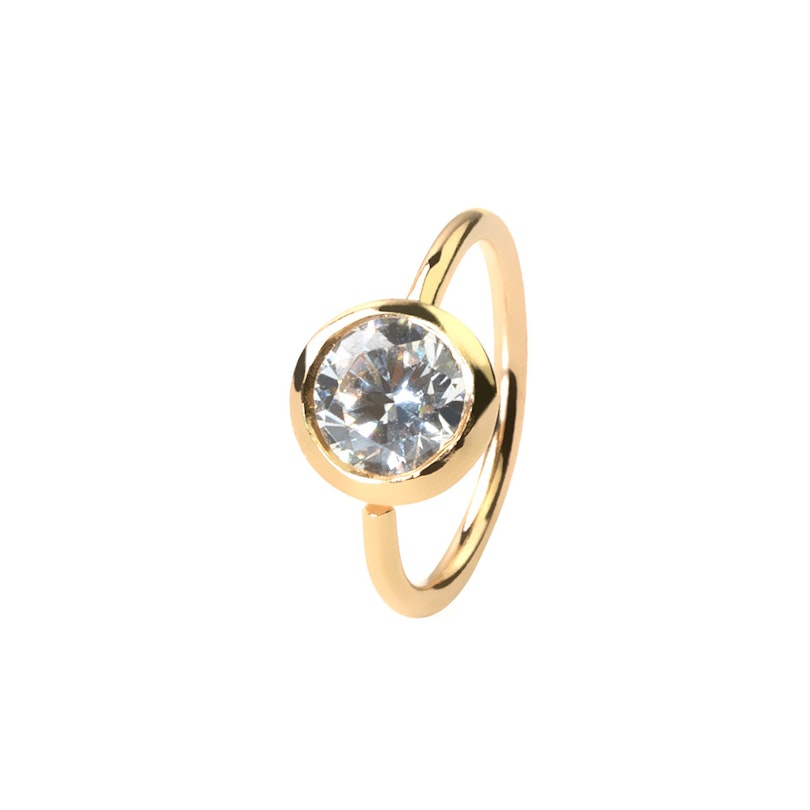 Hier siehst du einen wirklich süßen Kugelring aus 14 Karat Gold, für diejenigen, die wirklich Wert auf Qualität und stilvollen Schmuck legen. Der Ring hat eine Stabstärke von 0,8 mm und einen Durchmesser von 8 mm. Die schlichte Kugel wurde mit einem einzigen funkelnden Stein versehen, der leicht oval in der Form ist. Die Kugel sitzt fest an dem einen Ende des Ringes, so daß du dir keinen Sorgen darum machen musst, diese zu verlieren, wenn du den Schmuck mal heraus nimmst oder wieder einsetzen willst. Du musst den Ring nur mit einer leichten Drehung öffnen und dann das andere Ende des Ringes durch dein Piercing schieben. Mit einer leichten Drehung zurück sitzt der Schmuck fest und sich an seinem Platz.