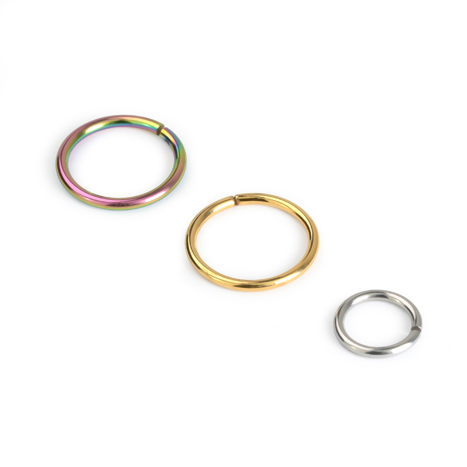 Mit dieser vereinfachten Ausgabe eines Segmentringes, wurde der Prozeß erheblich vereinfacht, den Ring in sein Piercing zu setzen. Es handelt sich hier um einen einfachen Ring mit einer ganz kleinen Öffnung, die man ohne Probleme auf- und zudrehen kann, um diesen dann in das gewünschte Piercing einzusetzen. Man klemmt danach den Ring einfach nur zusammen und je größer der Durchmesser ist und dünner das Material, desto einfacher geht es.