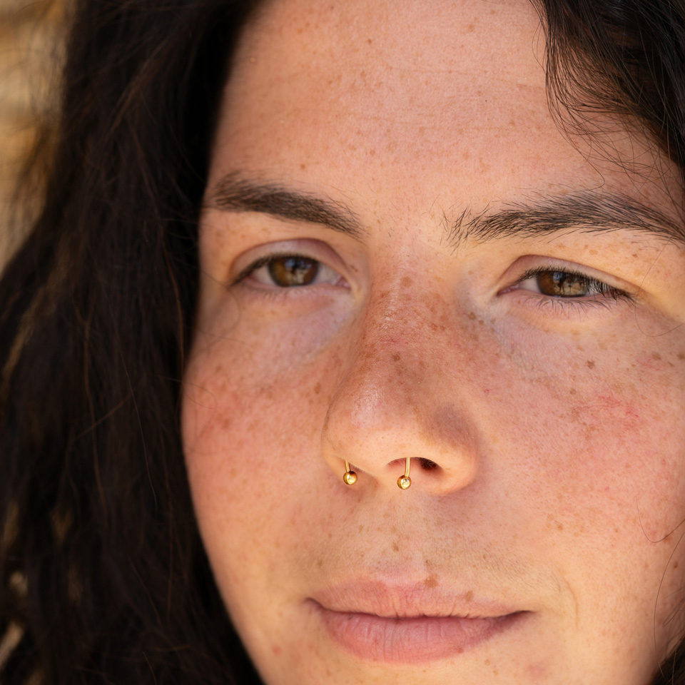Dieses Schmuckstück ist perfekt für ein Fotoshooting oder für diejenigen, die sich nicht sicher sind, ob ihnen ein Septum-Piercing steht. Die Magnete sitzen in den dünnen Wänden der Nase und nicht in dem harten Knorpel, den du mit deinen Fingern ertasten kannst. Die Anatomie und die Dicke deiner Nasenwand können sich darauf auswirken, wie das Piercing sitzt und wie stark die Magnete sein werden.