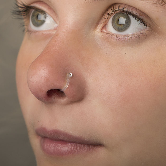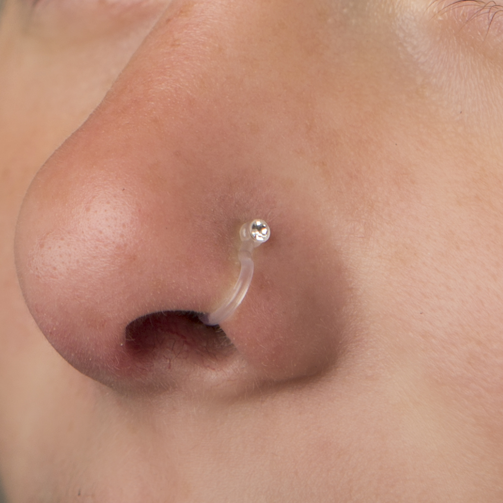 Hier bekommst du ein wirklich schönes Fake Nasenpiercing mit einem einfachen, diskreten Stein ohne dafür wirklich ein Piercingloch in der Nase haben zu müssen. Dieses schöne Schmuckstück sieht aus wie ein kleiner klarer Ring aus PTFE mit einem Stein, der in die Nase geht. In Wirklichkeit jedoch, ist dieser Ring nur ein kleiner Bügel, der um den Nasenflügel geklemmt wird und sich von jeder Seite an die Nasenwand pressen wird.
