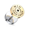 Hier siehst du einen Fake Plug mit der Rückseite einer Patrone. Der Grund, warum es hierbei um einen Fake Plug handelt, liegt darin, dass er die Illusion erzeugt, du hättest einen 10 mm großen Plug im Ohr, obwohl du nur ein gewöhnliches 1,2 mm Piercingloch hast. Sobald der Schmuck im Ohr sitzt ist kein Unterschied mehr zu einem echten Plug zu sehen. Der große Durchmesser der Vorderseite des Plugs bietet ausreichend Platz für den eingravierten Text - es wäre auch eine Schande gewesen, wäre der Schmuck so klein, dass man dem Text kaum sehen oder lesen könnte.