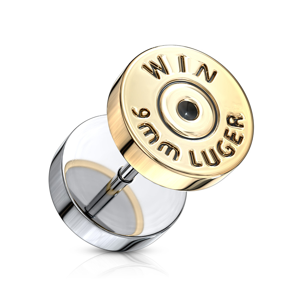 Hier siehst du einen Fake Plug mit der Rückseite einer Patrone. Der Grund, warum es hierbei um einen Fake Plug handelt, liegt darin, dass er die Illusion erzeugt, du hättest einen 10 mm großen Plug im Ohr, obwohl du nur ein gewöhnliches 1,2 mm Piercingloch hast. Sobald der Schmuck im Ohr sitzt ist kein Unterschied mehr zu einem echten Plug zu sehen. Der große Durchmesser der Vorderseite des Plugs bietet ausreichend Platz für den eingravierten Text - es wäre auch eine Schande gewesen, wäre der Schmuck so klein, dass man dem Text kaum sehen oder lesen könnte.