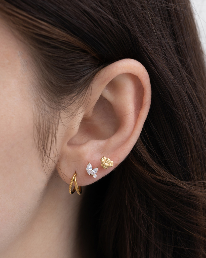 Erhältlich in gold oder silber, mit klaren Steinen. Der obere Teil des Designs hat einen Durchmesser von 6,9 mm, der untere Teil einen Durchmesser von 4 mm.