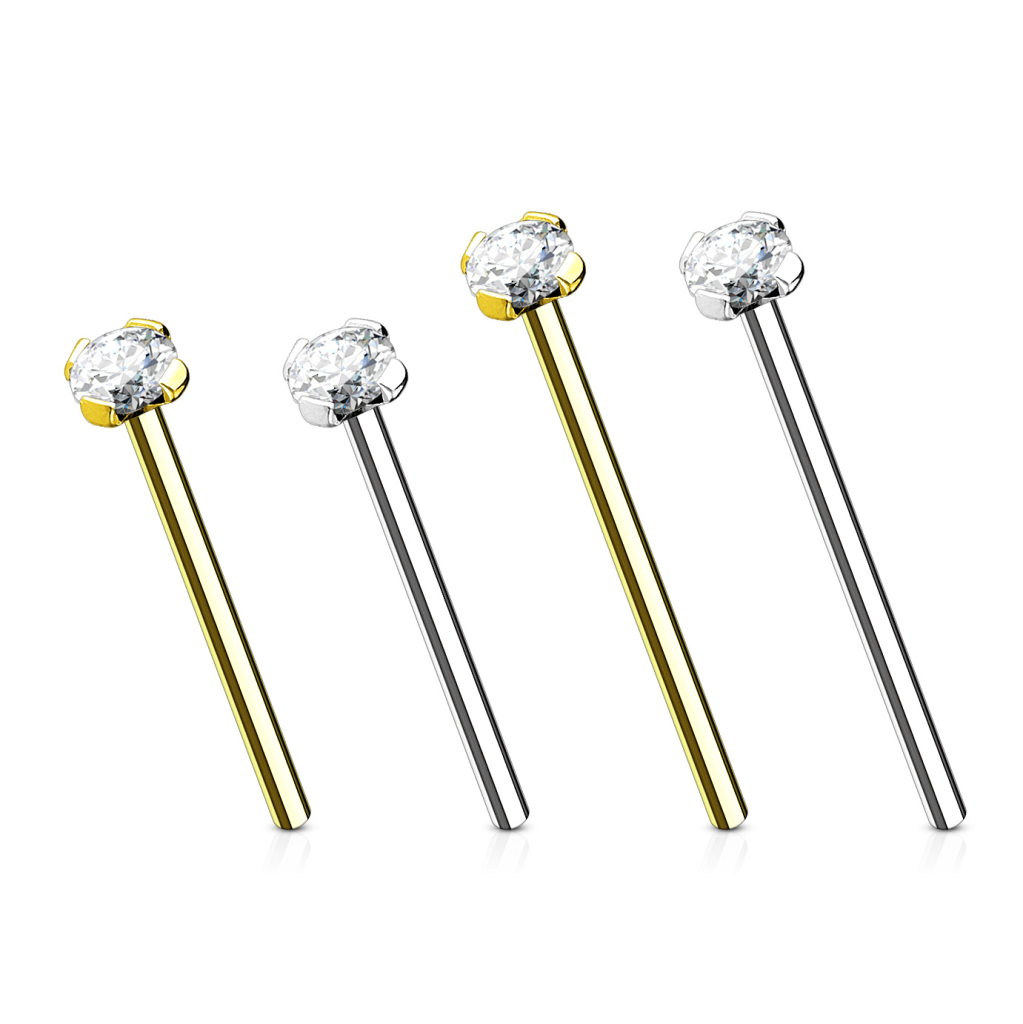 Das Nasenpiercing ist in verschiedenen Längen erhältlich und mit einem kleinen Werkzeug, ähnlich einer kleinen Zange, kann man den Stab richtig biegen, so dass er perfekt in dein Piercing passt. Bei allen Modellen sitzt in der Spitze des Stabes ein kleiner klarer Stein, der von vier kleinen Fangarmen fixiert wird. Auf diese Weise wird der Stein so wenig wie möglich verdeckt. Dies verleiht dem Schmuck ein klassisches und zeitloses Design.