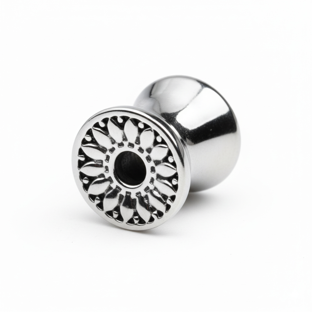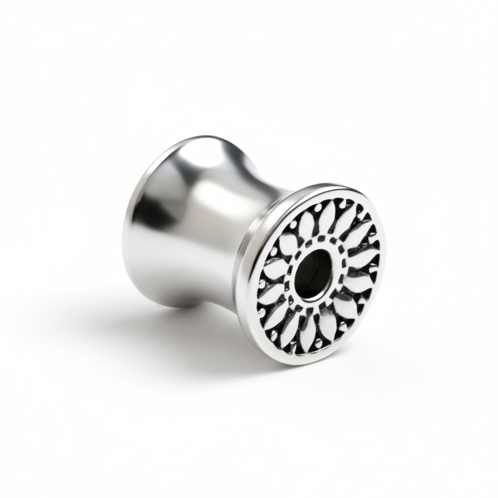 Der Gänseblümchen-Tunnel besteht aus einem einzigen Stück, damit alles simpel und stylisch bleibt. Ein Ring aus blütenblattförmigen Details sitzt vorn und verleiht deinen gedehnten Ohrläppchen eine weiche, strukturierte Kontur, die auffällt, ohne zu übertreiben.