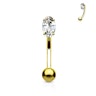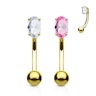 Süßer und leicht gebogener Stab aus 14 karärigen Gold mit einem schönen, eingefassten Stein an einem Ende. Der Stein ist leicht rechteckig und wird durch die Einfassung an seinem Platz gehalten und kann somit nicht herausfallen, wie bei einem geklebten Stein. Du kannst dich für einen klaren oder rosanen Stein auf deinem Goldstab entscheiden.