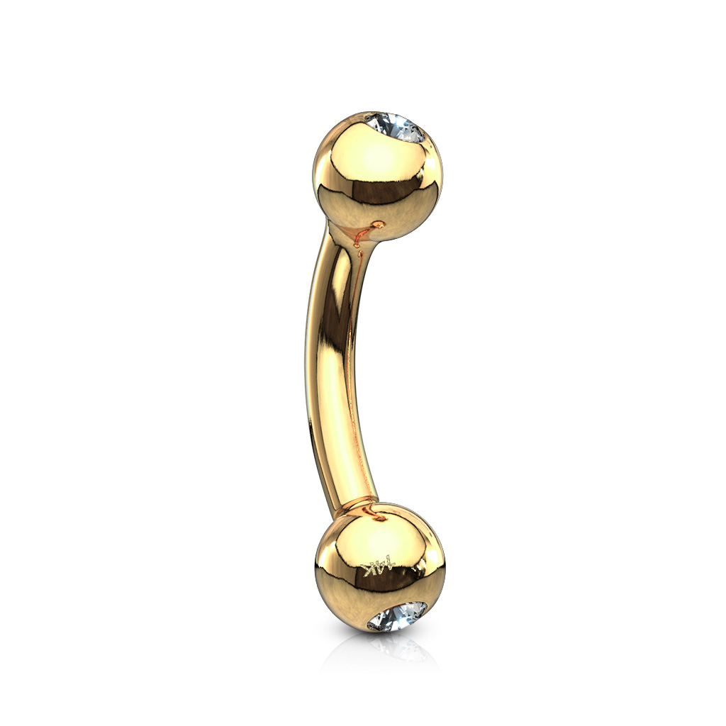Schöner, feminier Stab aus 14 Karat Gold mit einem funkelnden klaren Stein in beiden Kugeln. Dieser Piercingstab ist perfekt für dich, wenn du gerne das zeitlose, klassische Design mit einem Hauch von Eleganz bevorzugst und. Dieser Stab ist so diskret und schön, daß er fast unschuldig in deinem Piercing wirkt. Das einzig Auffallende werden die beiden glitzernden Steine an den Enden sein, aber ansonsten ist dieser Piercingstab eher diskret und zeitlos.