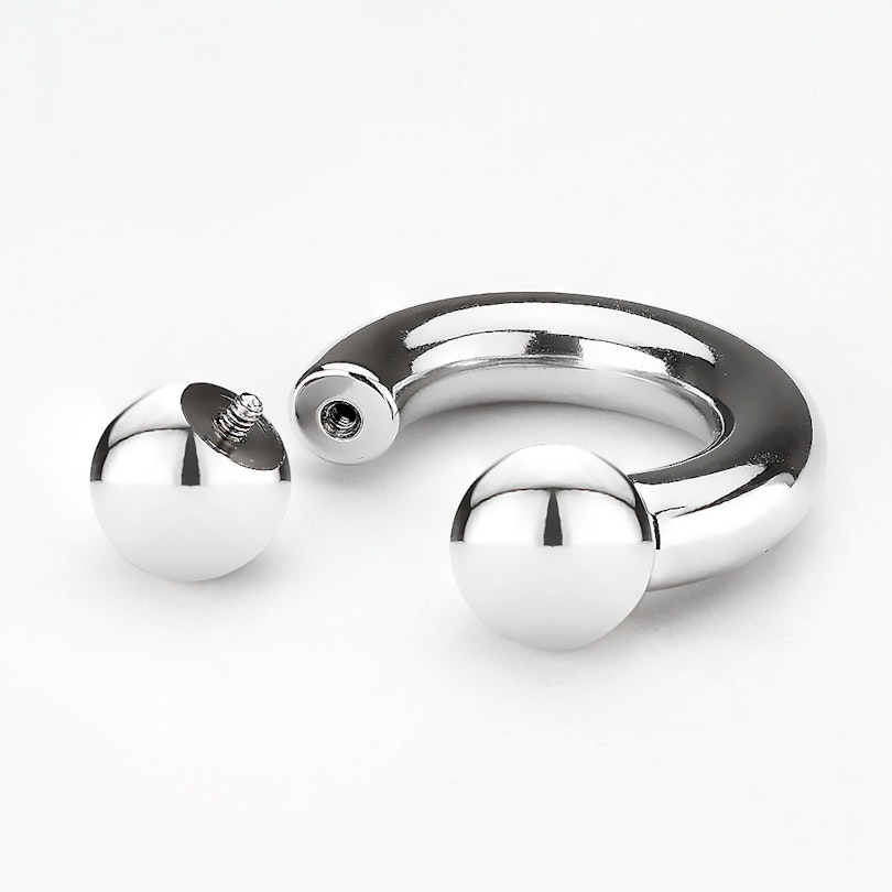 Das Hufeisen ist mit einem praktischen Schraubgewinde versehen, welches auf der Innenseite des Schmuckes sitzt. Das bedeutet, daß du die Kugeln abschrauben und das Hufeisen durch dein Piercingloch schieben kannst, ohne zu riskieren, daß deine Haut dabei geritzt wird. Denn das eigentliche Schraubteil sitzt an der Kugel und kann somit absolut schmerzfrei eingedreht werden, sobald das Hufeisen an seinem Platz sitzt.