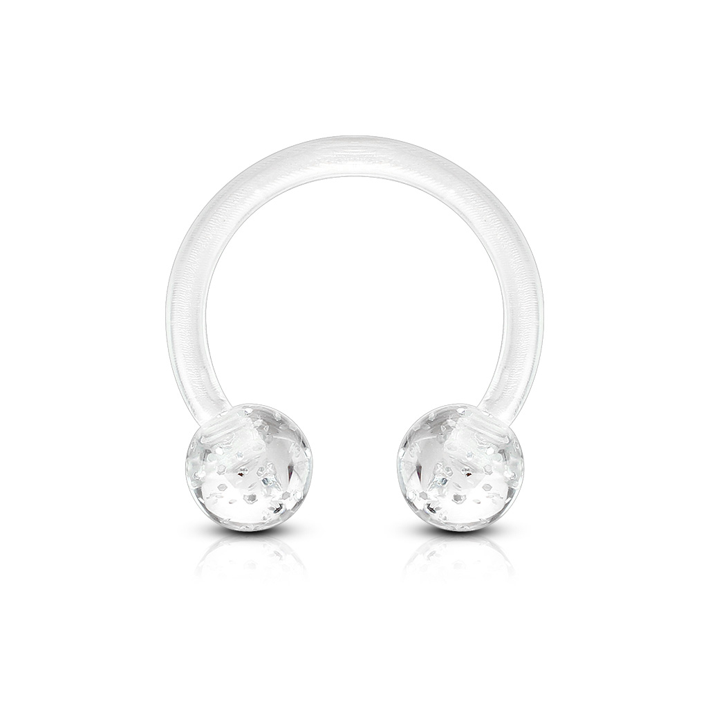 Auf dem obigen Bild siehst du ein Hufeisen, das aus Acryl besteht. Die Kugeln des Hufeisens haben ein eingearbeitetes Glitzermuster. Das Hufeisen ist in verschiedenen Farben erhältlich, wie unter anderem blau, grün und rosa. Die Farben der Hufeisen sind nicht 100% identisch mit den Farben der Kugeln. Zum Beispiel ist das blaue Hufeisen ein wenig heller als die zugehörigen Kugeln. Das Material des Hufeisens ist flexibel, was dir das Einsetzen des Schmuckes ins Piercingloch erleichtert. So kannst du das Hufeisen beim Einsetzen ein wenig biegen.