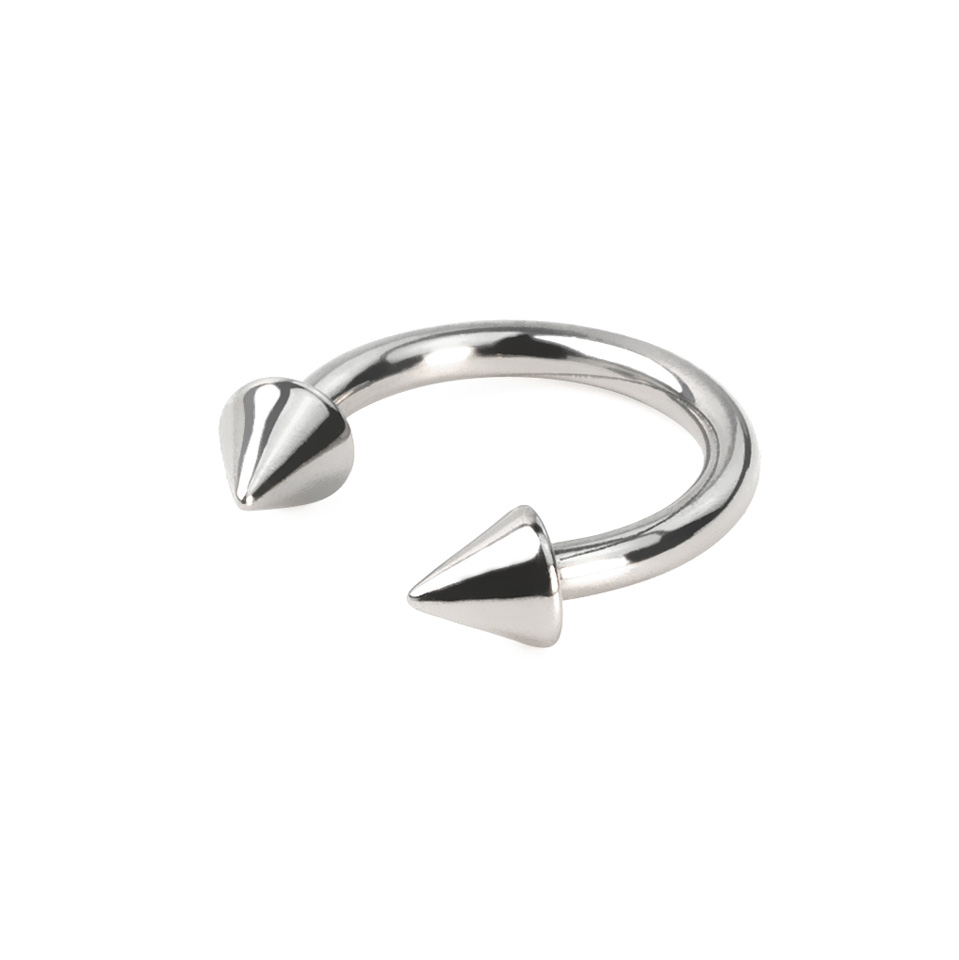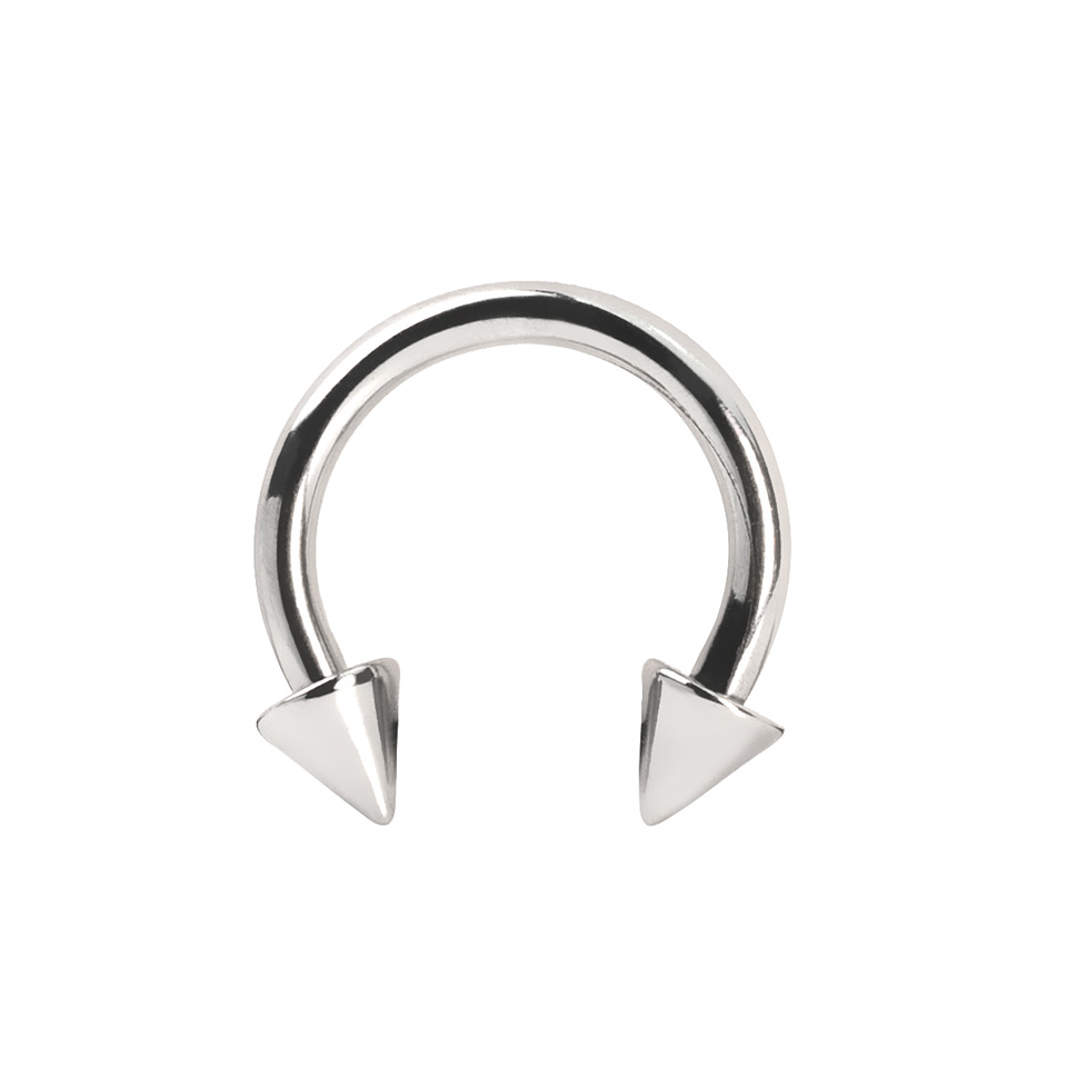 Ein Hufeisen wird auch "Horseshoe Barbell" genannt und kann für viele Piercings am Körper verwendet werden. Sehr beliebt sind Hufeisen für Augenbrauenpiercings oder auch Brustpiercings. Dieses Modell hat anstelle normaler Kugeln kleine Spikes erhalten.