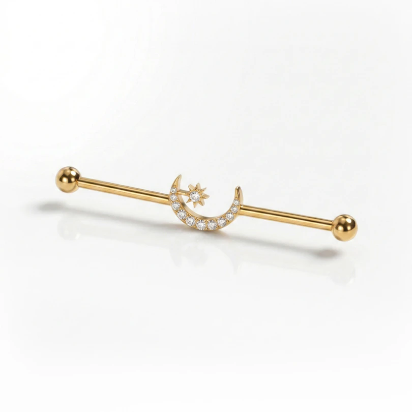 Der Industrialstab aus Titan mit Mond und Stern in der Mitte setzt einen klaren Fokus in deinem Industrialpiercing. Ein Halbmond sitzt in der Mitte und ist mit kleinen Schmucksteinen verziert, während ein winziger Stern direkt daneben für Kontrast sorgt, ohne dabei übertrieben zu wirken. Klare Formen treffen auf präzise Details. Erhältlich in den Farben Gold und Silber.