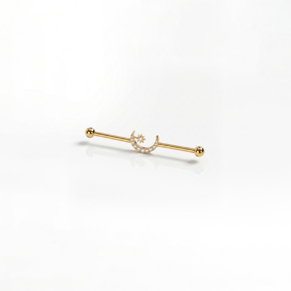 Der Industrialstab aus Titan mit Mond und Stern in der Mitte setzt einen klaren Fokus in deinem Industrialpiercing. Ein Halbmond sitzt in der Mitte und ist mit kleinen Schmucksteinen verziert, während ein winziger Stern direkt daneben für Kontrast sorgt, ohne dabei übertrieben zu wirken. Klare Formen treffen auf präzise Details. Erhältlich in den Farben Gold und Silber.
