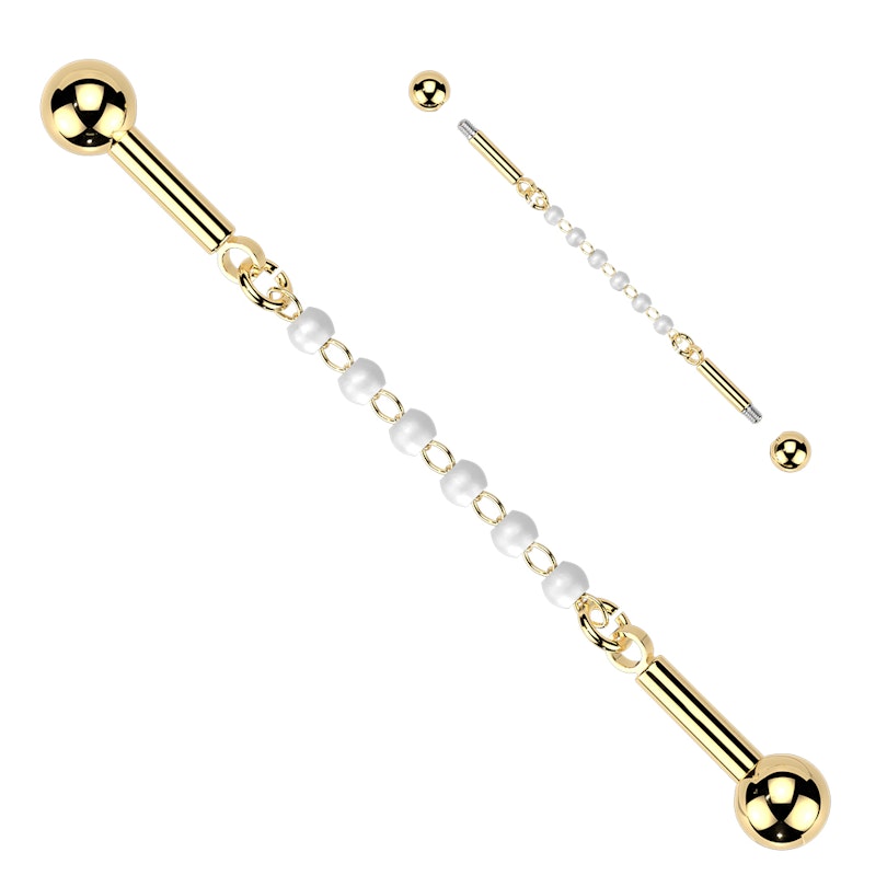 Der Industrialstab mit Perlenkette rundet die klassische Form eines Industrialpiercings harmonisch ab. Zwischen den Enden reihen sich zarte, perlenähnliche Elemente aneinander und werden von feinen Kettengliedern ergänzt, die dem Stab eine besonders schicke Note verleihen. Erhältlich in den Farben Gold- und Silber, eignet sich dieser Schmuck ideal für alle, die ihren Look auf das nächste Level bringen wollen.