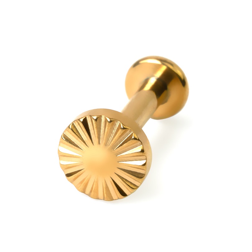 Dieses schicke Labret hat einen runden Aufsatz mit eingravierten Linien, die von der Mitte ausstrahlen. Es hat ein Innengewinde und eine flache Rückseite, die das Tragen angenehm macht und das Einsetzen des Piercings erleichtert. Dieses Labret ist aus Titan in Implantatqualität gefertigt und hypoallergen, also auch für empfindliche Haut geeignet. Du kannst zwischen einer goldenen und einer silbernen Ausführung wählen, die zu deinem Stil passt. Mit einer Stabstärke von 1,2 mm und einer breiten Auswahl an Längen ist es für die meisten Ohr- und Lippenpiercings geeignet.