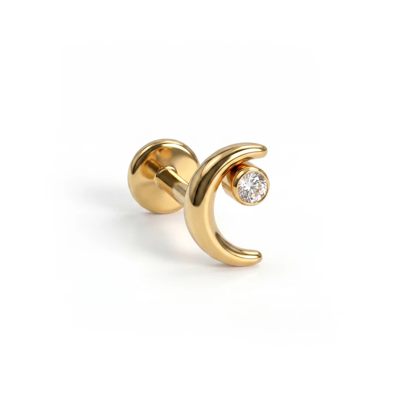 Das Mond-Labret mit Stern aus Titan verbindet beide Formen zu einem kleinen, gebogenen Schmuckstück. Der Mond liegt sanft an der Haut, während der kleine Schmuckstein als Stern das Ganze zu einem echten Hingucker macht. Es lässt sich einfach in verschiedene Kombinationen einfügen und sieht dennoch einzigartig aus. Erhältlich in den Farben Gold und Silber.