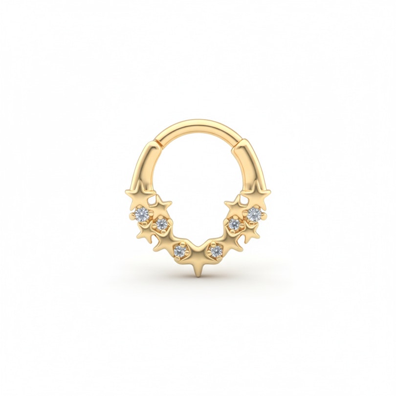 Dieser nach vorne gerichtete Ring mit Sternen und Monden passt hervorragend in deine Sammlung. Durch seine Scharnieröffnung lässt er sich leicht in dein Piercing einsetzen und sichern.