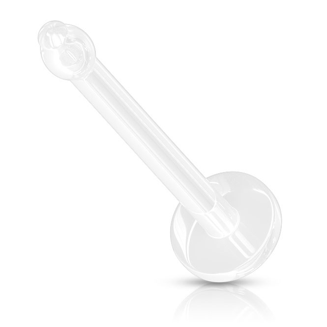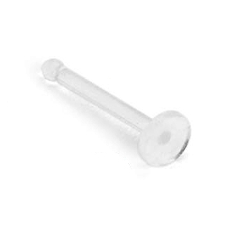 Der Nasenretainer besteht aus klaren Plastik und besteht eigentlich nur aus einem 0,8 mm dünnen Stab von 7 mm Länge. Am Ende des Stabes ist eine kleine Kugel befestigt, die nur minimal größer als der Stab an sich ist. Diese Kugel hat die Funktion eines Widerhaken, damit der Nasenretainer nicht einfach heraus fallen kann. Am entgegengesetzten Ende, also der Vorderansicht, ist eine kleine "Platte" befestigt, die einen Durchmesser von 2 mm hat. Das ist nicht besonders groß und die Platte legt sich ganz flach an deinen Nasenflügel, wenn du den Retainer in der Nase sitzen hast.