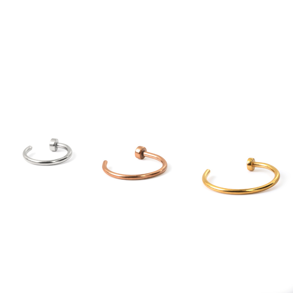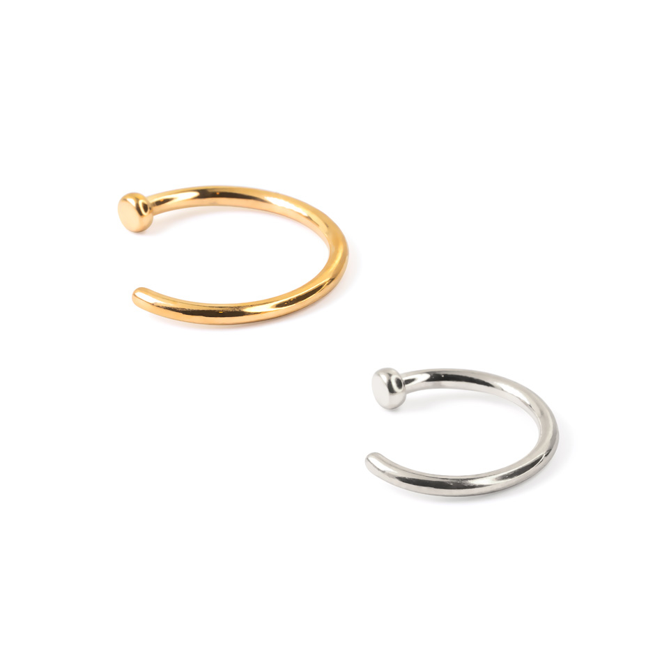 Diesen Nasenring gibt es in vielen verschiedenen Modellen. Alle haben die Form gemeinsam, die wie ein C aussieht. An einem Ende des Ringes ist ein kleiner "Stopklotz", der dafür sorgt, dass der Ring nicht aus der Nase fallen kann. Das andere Ende ist so abgerundet, dass man sich nicht beim Einsetzen daran verletzten kann oder kleine, feine Risse in seiner Nase erzeugt. Es liegt ganz bei dir, welchen Durchmesser, welche Farbe oder Stabstärke am besten zu deinem Nasenpiercing passt.