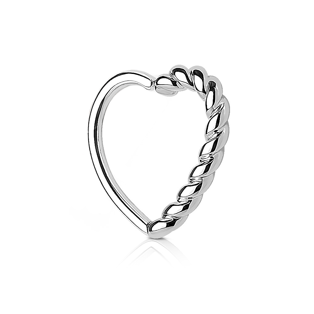 Das Piercing besteht aus einem Stück Metall, welches anschließend wie ein Herz geformt wurde. Die Innenmaße dieses Herzens sind 10 mm breit und 9 mm hoch. Die beiden Enden des Schmuckstückes treffen sich auf der Oberseite des Herzens. Die eine Hälfte des Schmuckes ist komplett glatt und die andere Hälfte hat ein gedrehtes Design. Wenn du den Schmuck in einem Ohrpiercing tragen möchtest, kannst du ihn sowohl auf der rechten als auf der linken Seite benutzen, da die Drehung auf beiden Seiten des Herzens sichtbar ist. Anderer Schmuck hat eine Vorder- und eine Rückseite, bei diesem ist das nicht der Fall.
