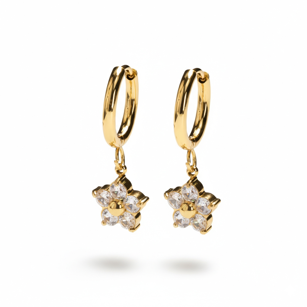 Dieses Paar Ohrringe mit Herzanhänger mit Blumenanhänger sind dazu gemacht, aufzufallen. Jeder Ring hat einen kleinen steinbesetzten Blumenanhänger in einer feinen Zackenfassung, der bei Bewegung sofort die Blicke auf sich zieht. Diese Ohrringe bleiben nicht unbemerkt. Der praktische Klappverschluss sorgt für einfaches Anlegen und angenehmes Tragen. Erhältlich in goldener und silberner Farbe.