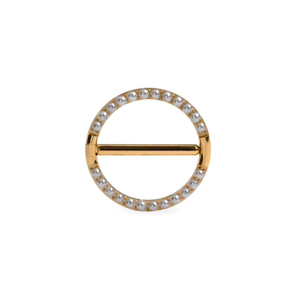 Der perlenbesetzte Brustwarzenklicker aus Titan ist der Beweis, dass Perlen nicht nur an Halsketten schön aussehen. Ein ganzer Kreis von zackenbesetzten Perlen in Gold- oder Silberfarbe umrahmt dein Piercing mit einem gewissen Etwas.