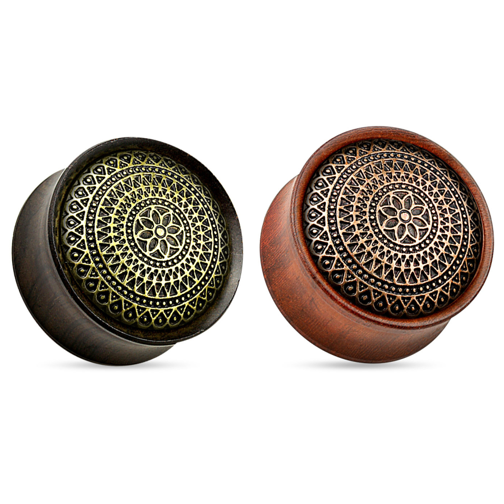 Diesen wunderschönen Plug haben wir in zwei verschiedenen Holzsorten auf Lager. Wähle zwischen dem rötlichen Rosenholz oder dem edlen schwarzen Ebenholz. Die Farbe der Verzierungen stehen in einem schönen Kontrast zu der natürlichen Holzfarbe. Die goldene Farbe des Musters lässt den schwarzen Plug antik und wertvolll erscheinen wogegen die rötliche Farbe des Rosenholzes schön mit dem kupferfarbenden Muster harmoniert und ihm einen warmen Glanz verleiht.