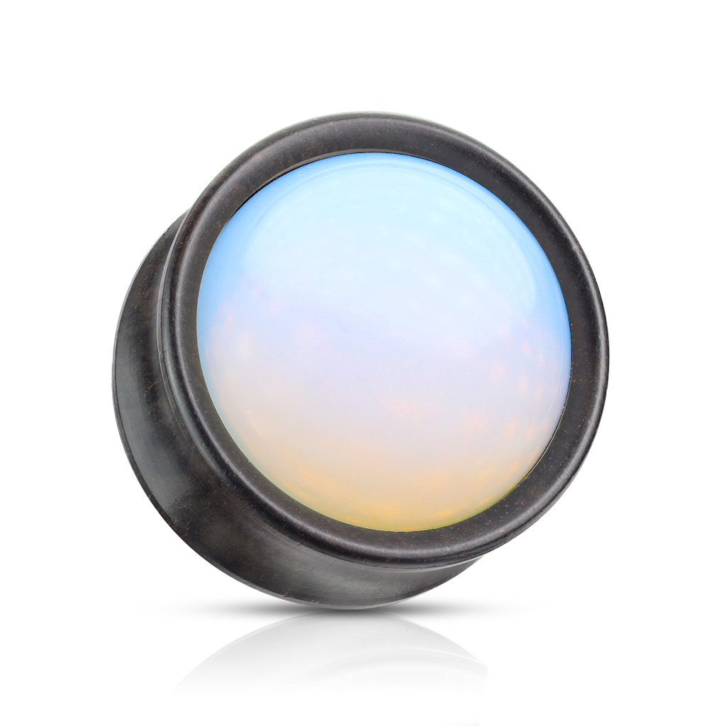 Dieser Plug besteht aus zwei organischen Materialien, nämlich Holz und Glas. Ob Glas ein organisches Material ist, kann diskutiert werden, da es aus flüssigem Sand künstlich hergestellt wird. In jedem Fall ist der Plug mit seiner warmen und braunen Holzfarbe und dem milchig weißen Opalit eine Augenweide. Opalit ist ein nuancenveränderndes Material. Es ist in erster Linie weiß, es lassen sich jedoch auch Farben wie Blau, Rosa und Orange finden, je nachdem wie das Licht auf den Schmuck fällt. Der Opalit auf der Vorderseite ist Konvex, somit biegt er sich leicht aus dem Plug raus. Die Rückseite ist wie gewohnt flach.
