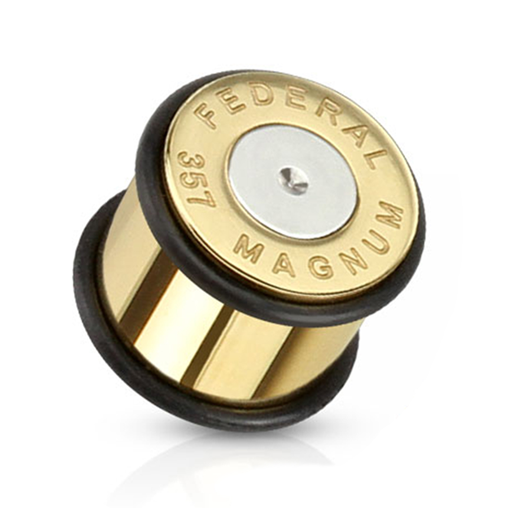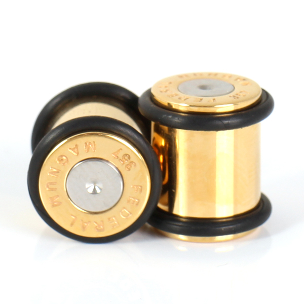 Der Plug wurde aus Chirurgenstahl hergestellt und später mit einer dünnen Schicht vergoldet, so daß der typische Patronenlook entsteht. Der Schmuck wird mit zwei O-Ringen geliefert, so daß er nicht aus dem Ohr herausfallen kann.