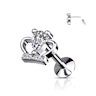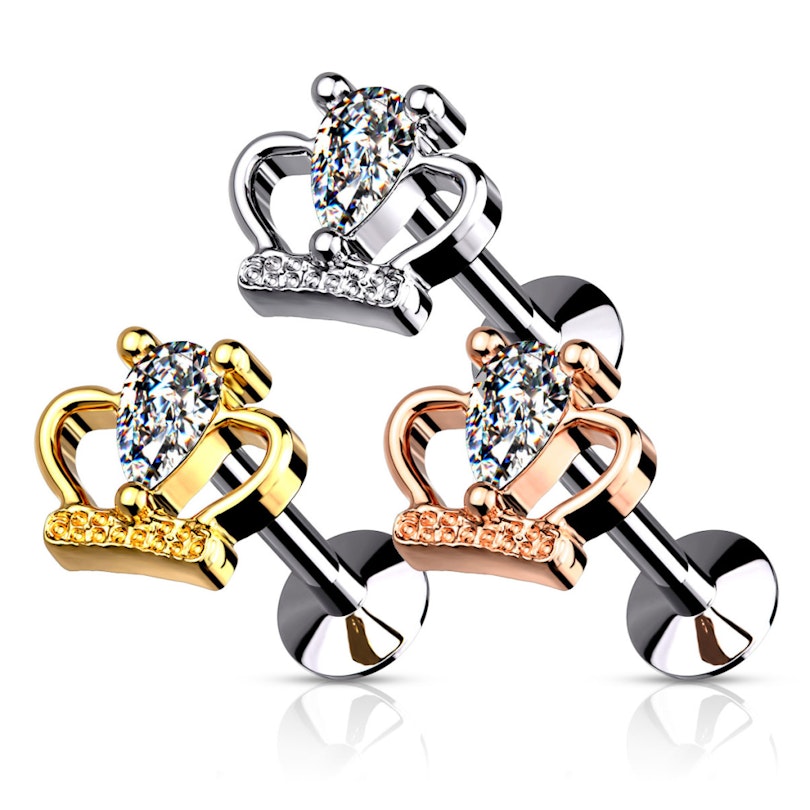 Dieses Labret hat eine schöne Krone auf der Vorderseite. Die Krone ist in verschiedenen Farben erhältlich. Alle Modelle haben die gleiche Länge, Dicke und Steinfarbe. Die Krone hat einen schönen umgedrehten, tropfenförmigen, klaren Stein in der Mitte. Auf der Rückseite der Krone befindet sich ein kleiner Stift, der in das Barbell geschoben wird. Es gibt also kein Gewinde, das aufgeschraubt werden muss. Wenn du denkst, dass die Krone zu leicht herauszunehmen ist, kannst du dem Stift eine kleine Biegung geben, damit er besser in die Schnalle unten im Barbell selbst passt.
