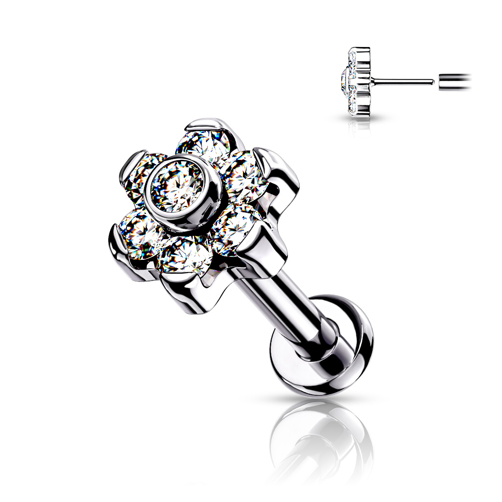 Die Oberseite des Labret besteht aus sieben winzigen Steinen, die zusammen eine kleine Blume bilden -- eine wunderschöne Blume mit sechs Blütenblättern und einem Mittelstein. Du kannst die Farbe der Steine wählen. Auf der Rückseite der Blume ist ein kleiner Stift montiert, der als Verschluss dient. Du kannst den Stift einfach aus dem Stab herausziehen, den Stab durch dein Piercing stecken und dann den Stift wieder in den Stab drücken. Der Stift wird in Spannung im Inneren des Stabes sitzen. Wenn du ihn mehrmals rein- und rausnimmst, wirst du vielleicht feststellen, dass es mit der Zeit einfacher wird. Aber mach dir keine Sorgen! Du kannst das ganz einfach lösen, indem du die obere Hälfte in die Bar steckst und sie leicht biegst. Dadurch wird die Spannung des Stifts in der Stange wieder stärker.