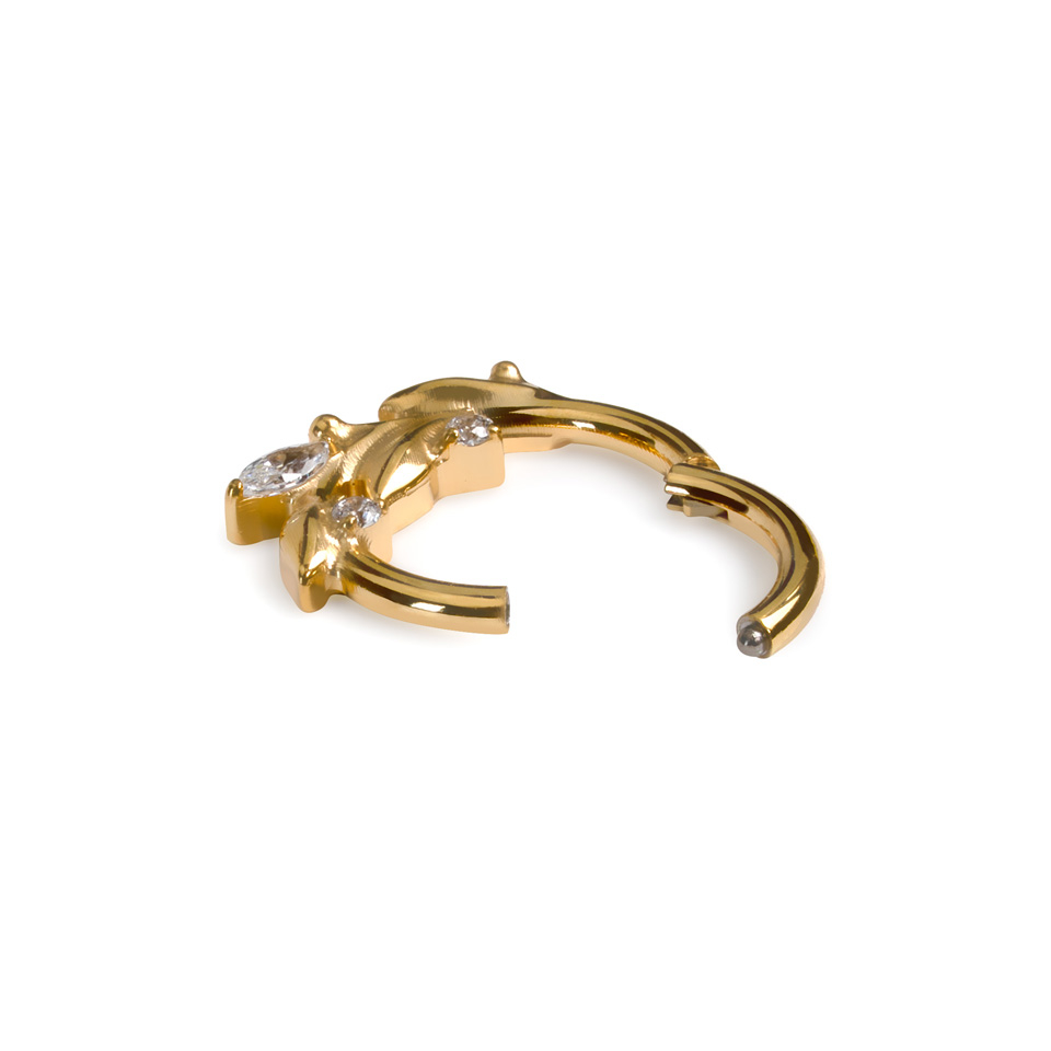 Dieser hübsche Titanring mit zarten Blättern besteht aus Titan und ist daher für empfindliche Haut geeignet. Der Scharniermechanismus ermöglicht eine einfache Befestigung am Piercing.