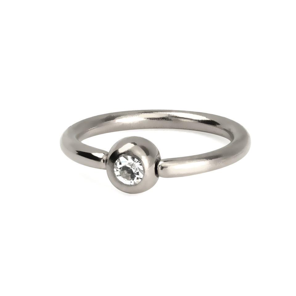 Der Ring hier hat keine losen Teile, wie bei den meisten Kugelringen. Diese Kugel ist nämlich festgeschweißt, so daß du die Kugel nicht herausnehmen musst, bevor du den Ring einsetzen willst. Du musst bei diesem Ring nur die beiden Enden entgegengesetzt zueinander auseinander twisten, so daß der Ring so aussieht, wie oben rechts in der Ecke auf dem Bild. Dann kannst du ihn problemlos einsetzen und wieder zusammen drehen.